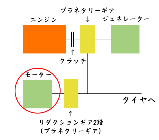 基本的にモーターにはトランスミッションが不要なんですが、これらのように電圧、大きさの制限のため回転数や出力に制限が出ています。そのため THS-II ではモーター用にトランスミッションの役割を果たすリダクションギアが備わっています。